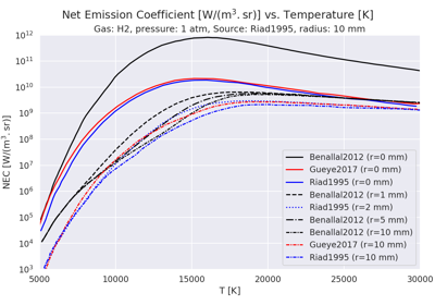 Methane and hydrogen radiation properties in Local Thermal Equilibrium (LTE), using the Net Emission Coefficient (NEC) method for now.