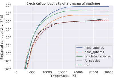 Plot electrical conductivity vs. temperature for a plasma of methane.