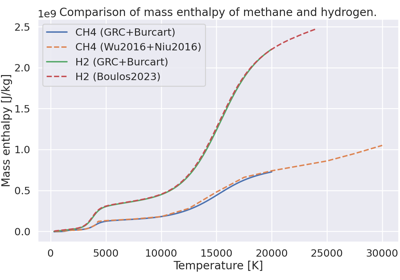 Plot mass enthalpy vs. temperature for methane and hydrogen.